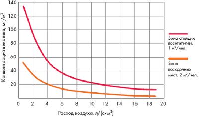 На рис. 1 представлена зависимость между концентрацией никотина и расходом воздуха при выше указанных условиях для зоны стоящих посетителей и зоны посадочных мест соответственно. Если вентиляция недостаточна, концентрация никотина может, как видно из графика, быстро вырасти до 100 мг/м3 и выше. Этот уровень подтверждается фактическими результатами измерений. Снижение концентрации никотина до значений 10 мг/м3 и ниже потребовало бы чрезвычайно больших расходов воздуха.